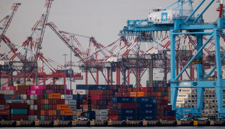 Cranes stand over shipping containers at Port Newark on March 26, 2024.