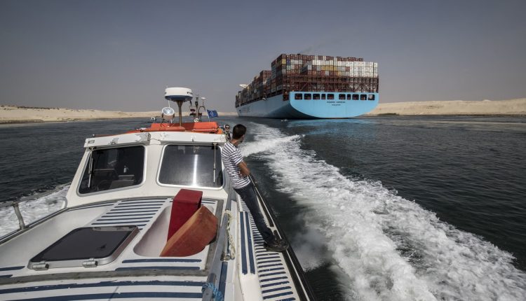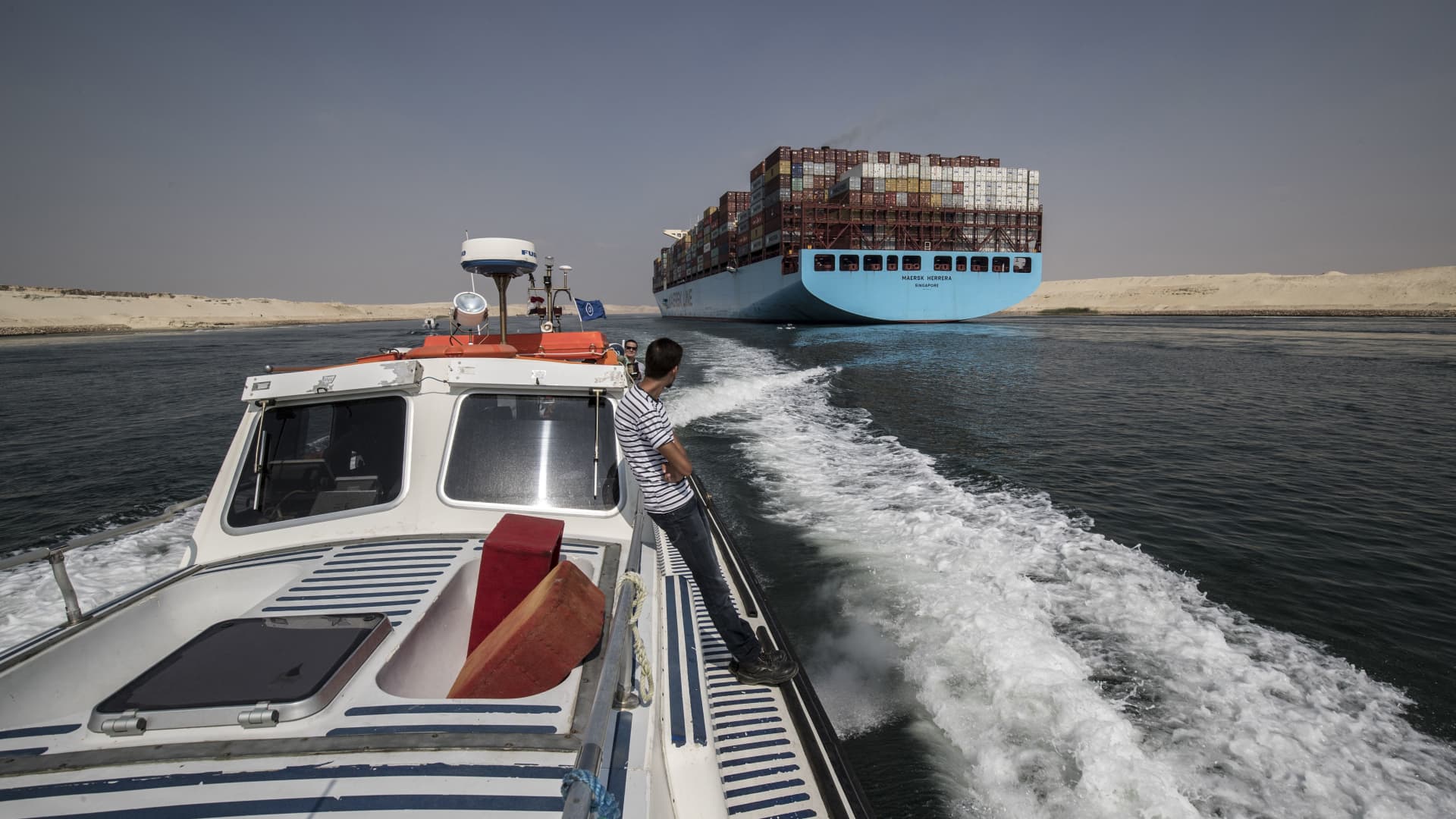 A man standing on a boat looks on as a container ship sails through the new section of the Suez Canal in the Egyptian port city of Ismailia, 135 kms northeast of the caital Cairo on October 10, 2019.