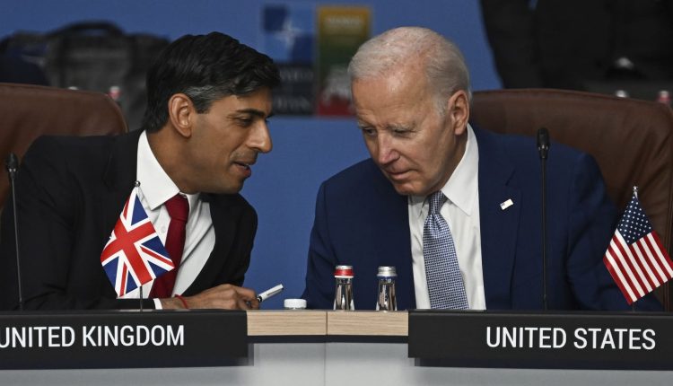 Britain’s Prime Minister Rishi Sunak, left, and U.S. President Joe Biden speak at the start of the meeting of the North Atlantic Council (NAC) during the NATO Summit in Vilnius, Lithuania, July 11, 2023.