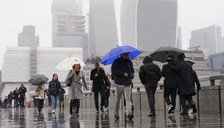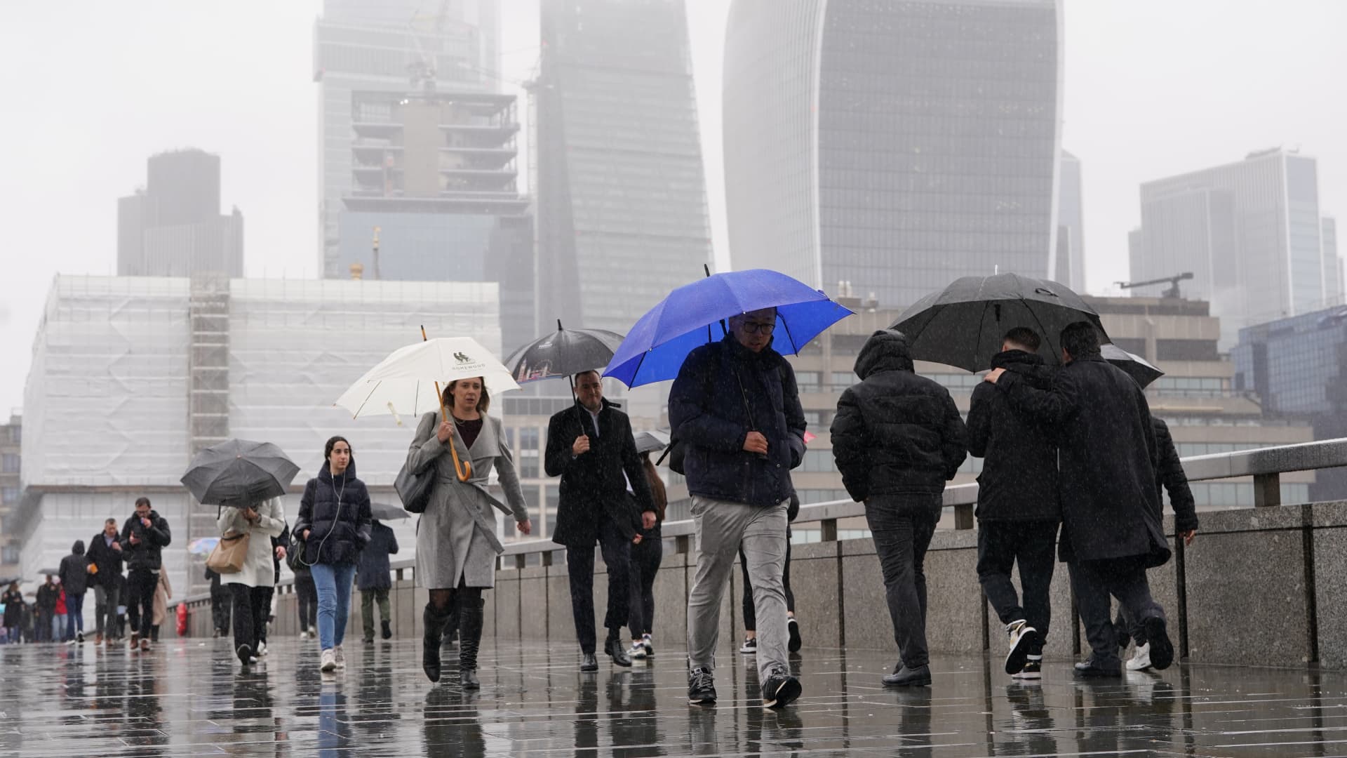 People walk in the rain over London Bridge in central London. Picture date: Tuesday March 12, 2024.