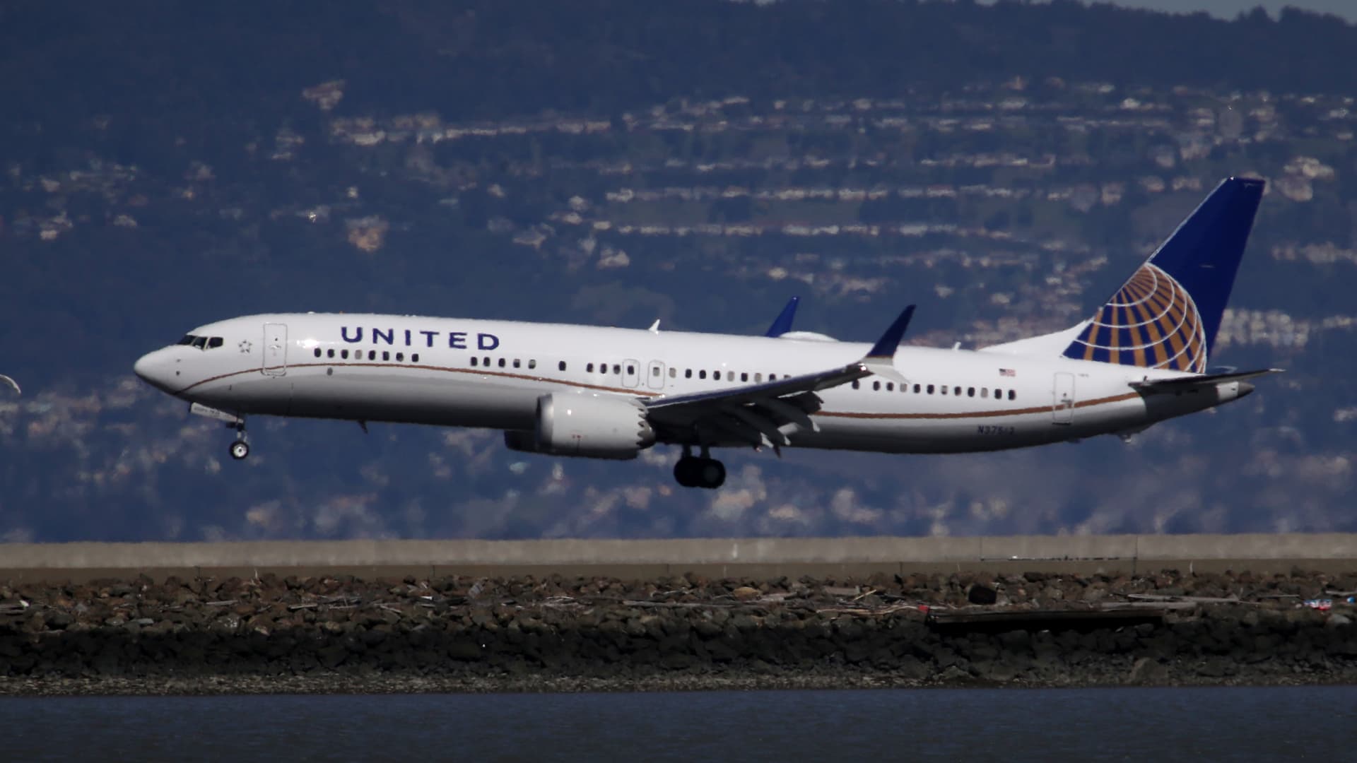 A United Airlines Boeing 737 Max 9 aircraft lands at San Francisco International Airport on March 13, 2019 in Burlingame, California.