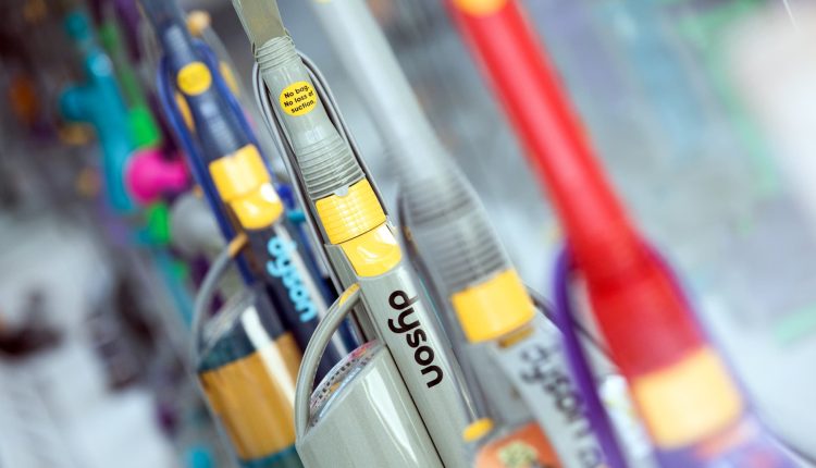 A selection of vacuum cleaners sit in the reception area at the Dyson Group campus in Malmesbury, U.K., on Wednesday, Sept. 26, 2018.