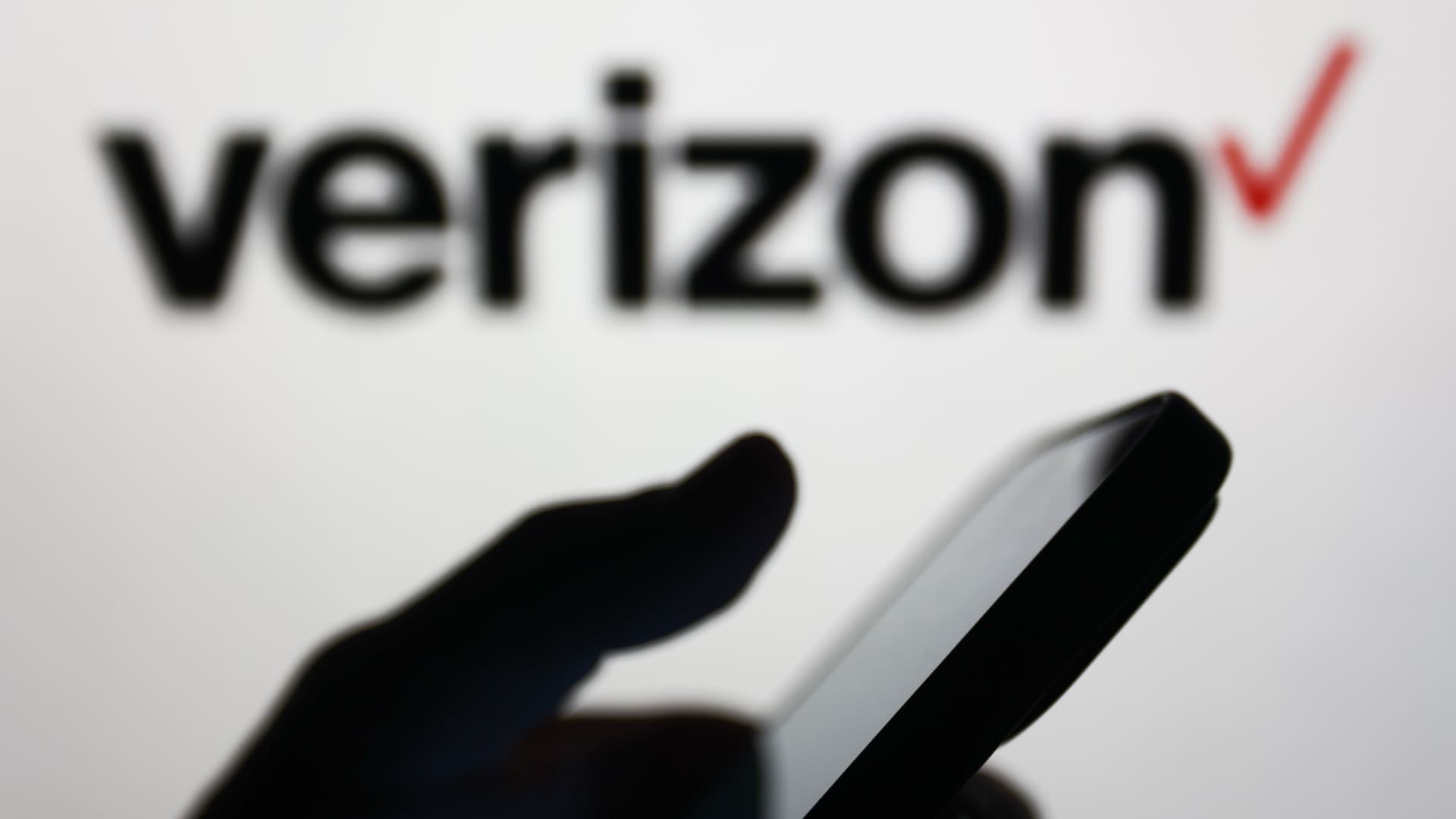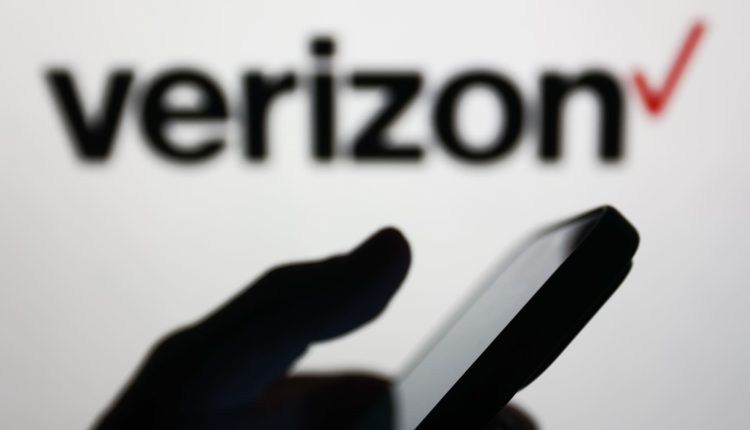 Verizon logo displayed on a laptop screen and a smartphone are seen in this illustration photo taken in Krakow, Poland on February 22, 2024.