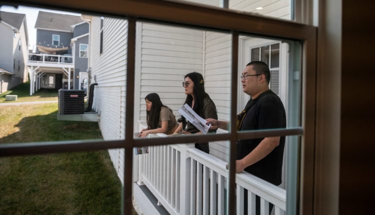 Prospective home buyers look from the balcony of a home for sale during an Open House in a neighborhood in Clarksburg, Maryland on September 3, 2023.
