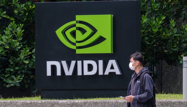 A man wearing a mask walks past a Nvidia logo in Taipei, Taiwan.