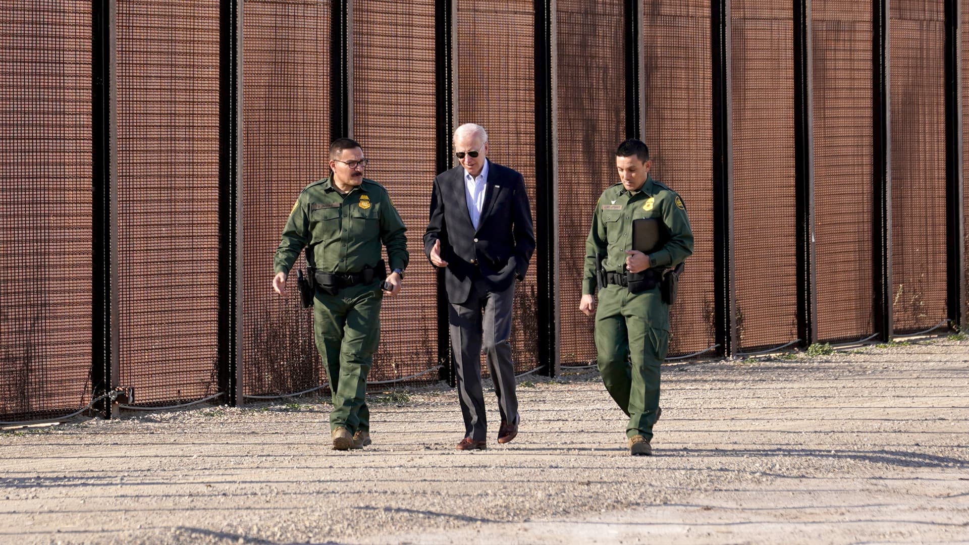 U.S. President Joe Biden speaks with border patrol officers as he walks along the border fence during his visit to the U.S.-Mexico border to assess border enforcement operations, in El Paso, Texas, on Jan. 8, 2023.