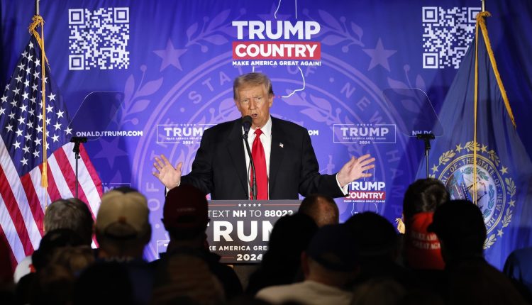 Republican presidential candidate, former U.S. President Donald Trump talks to supporters during a campaign rally at the Sheraton Portsmouth Harborside Hotel on January 17, 2024 in Portsmouth, New Hampshire.