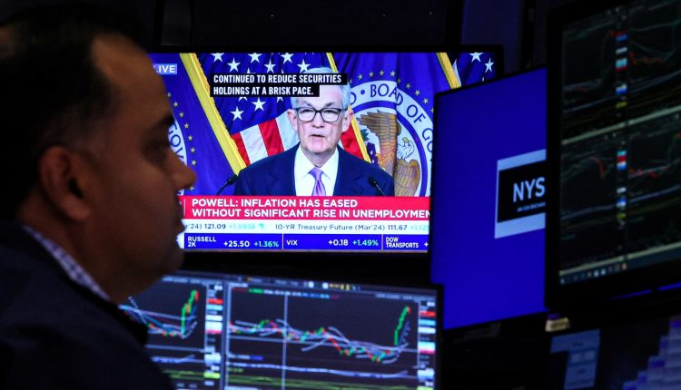 A trader works, as a screen displays a news conference by Federal Reserve Board Chairman Jerome Powell following the Fed rate announcement, on the floor of the New York Stock Exchange (NYSE) in New York City, U.S., December 13, 2023.