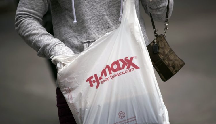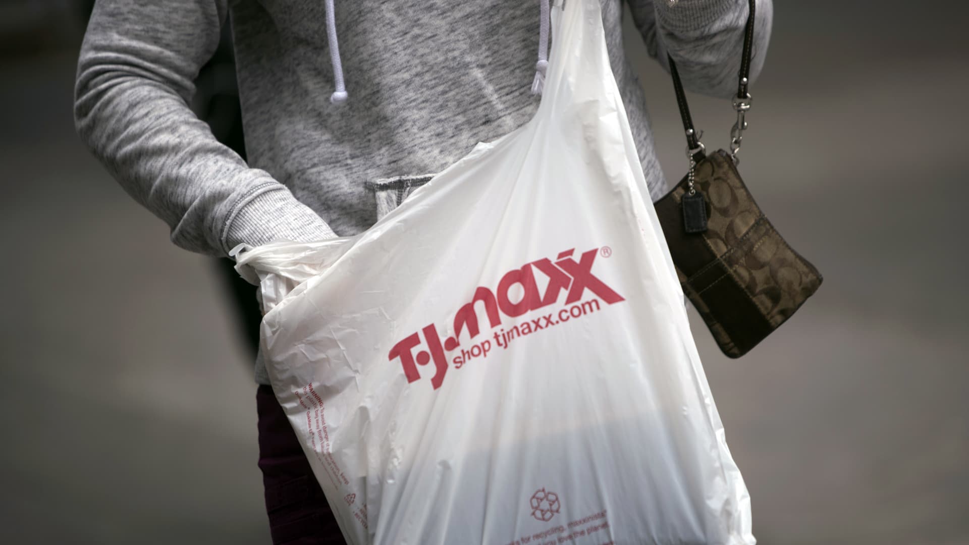 A shopper carries a bag outside a TJ Maxx store in New York, U.S.