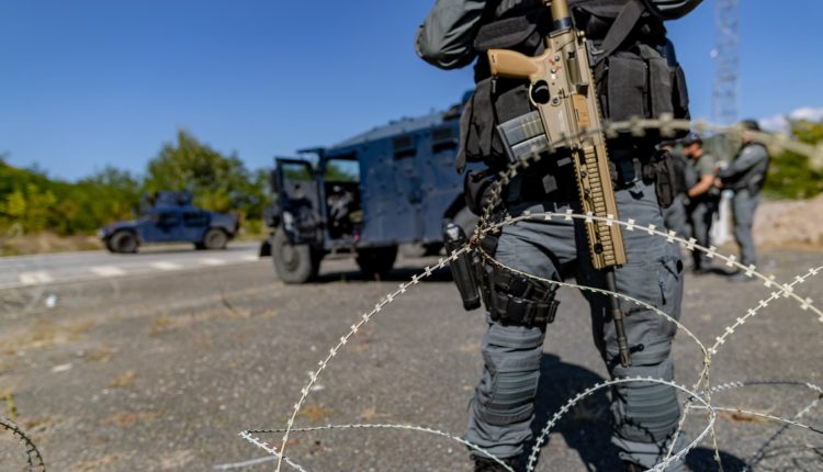 Members of a Kosovo police special unit stand guard in an area around the Banjska Monastery in Banjska, north Kosovo, some 15km from the border with Serbia, on September 27, 2023.
