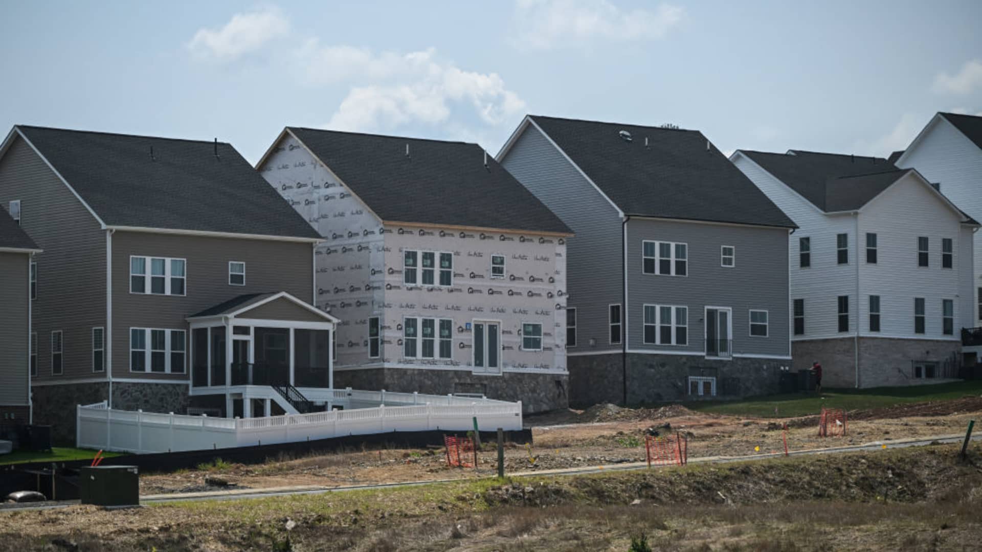 A house under construction is seen between completed houses in a new development in Brambleton, Virginia on August 14, 2024.