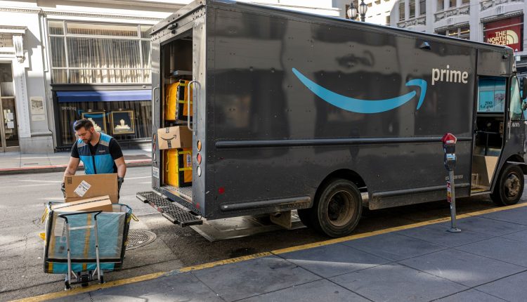 A worker delivers Amazon packages in San Francisco on Oct. 5, 2022.