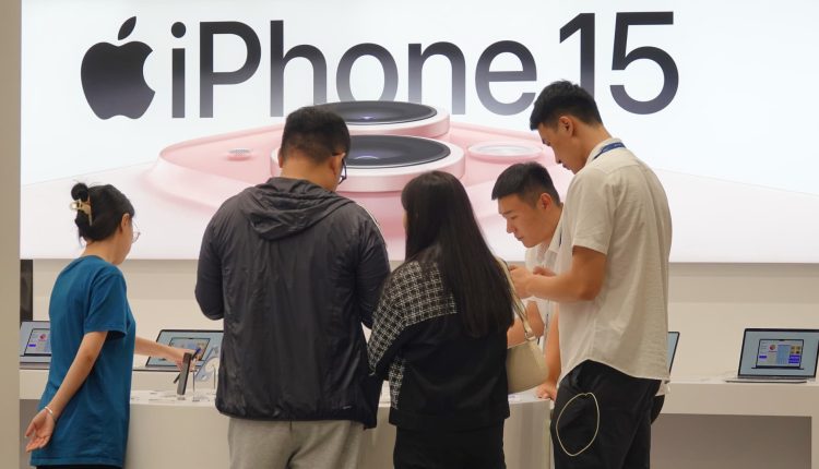 Customers learn about the newly launched iPhone15 at an Apple store in Yantai, East China’s Shandong province, Sept 28, 2023.