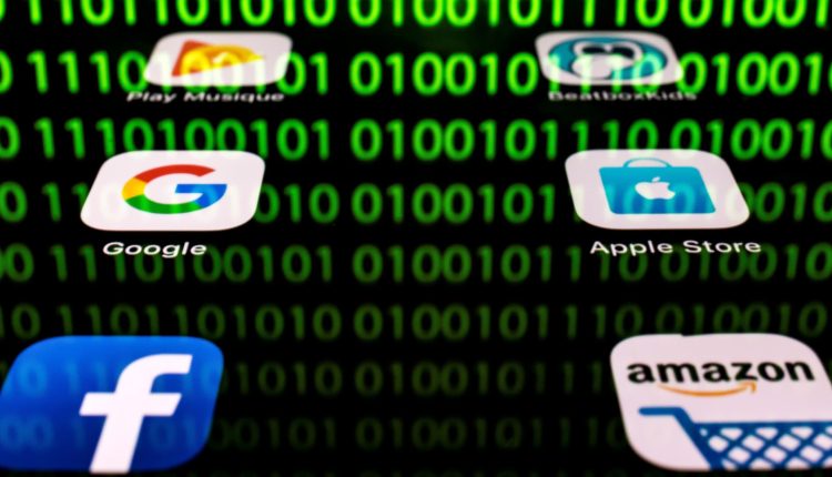 This illustration picture taken on April 20, 2018 in Paris shows apps for Google, Amazon, Facebook, Apple (GAFA) and the reflexion of a binary code displayed on a tablet screen. (Photo by Lionel BONAVENTURE / AFP) (Photo credit should read LIONEL BONAVENTURE/AFP via Getty Images)