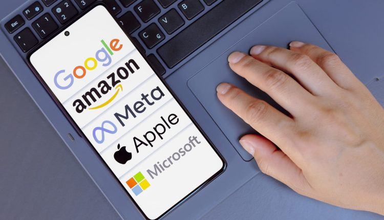 In this photo illustration, the Google, Amazon, Meta, Apple and Microsoft logos is displayed on a smartphone screen.