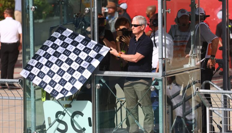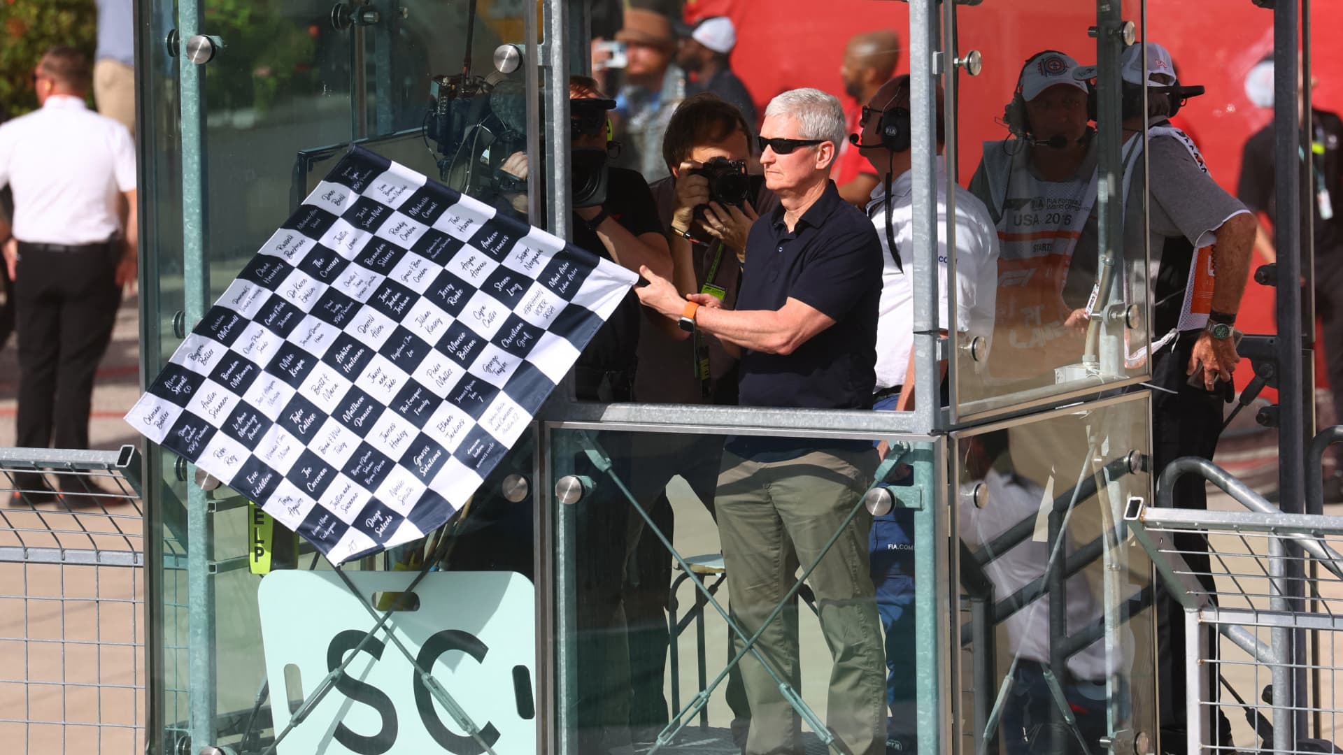 Apple CEO Tim Cook waves a checkered flag to the race winner at the Formula One United States Grand Prix Circuit of the Americas in Austin, Texas, on Oct. 23, 2022.