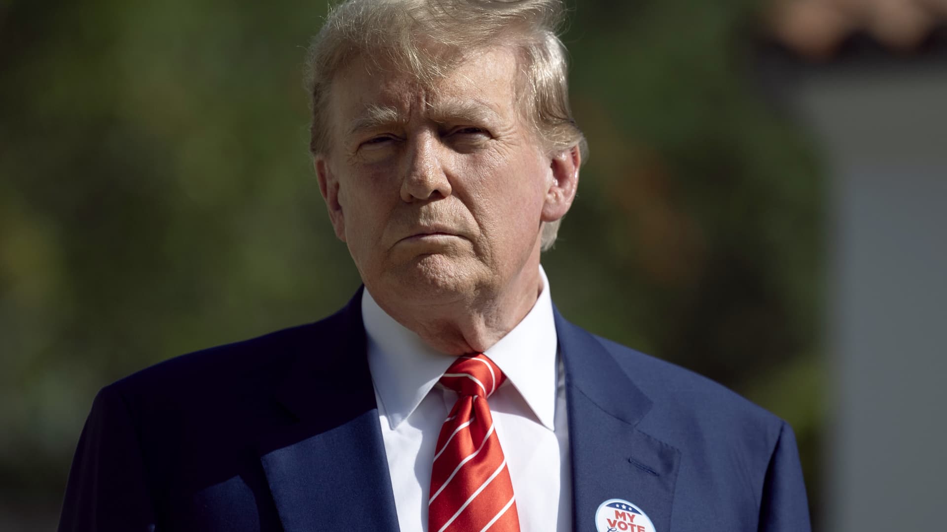 Former U.S. President Donald Trump speaks to the media after voting at a polling station setup in the Morton and Barbara Mandel Recreation Center on March 19, 2024, in Palm Beach, Florida.