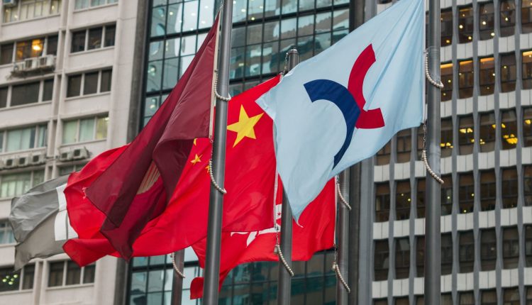 The flag (R) of the Hong Kong Exchanges and Clearing Limited (HKEX) is hoisted next to China’s flag (C) in Hong Kong on August 16, 2016.