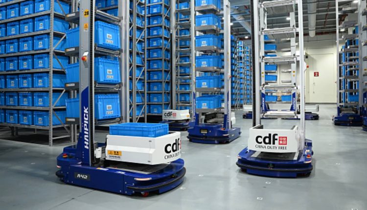 Pictured here are self-driving robots in a China Duty Free Group’s warehouse in Haikou, Hainan, on March 20, 2023.