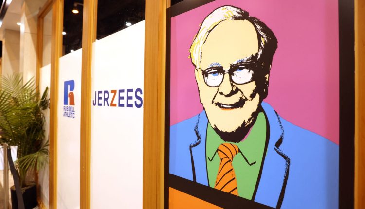 An Andy Warhol-like print of Berkshire Hathaway CEO Warren Buffett hangs outside a clothing stand during the first in-person annual meeting since 2019 of Berkshire Hathaway Inc in Omaha, Nebraska, U.S. April 30, 2022.