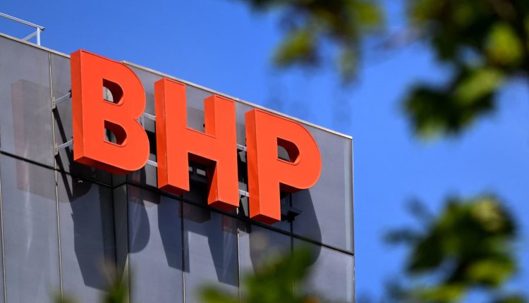 The company logo adorns the side of the BHP gobal headquarters in Melbourne on February 21, 2023. – The Australian multinational, a leading producer of metallurgical coal, iron ore, nickel, copper and potash, said net profit slumped 32 percent year-on-year to 6.46 billion US dollars in the six months to December 31. (Photo by William WEST / AFP) (Photo by WILLIAM WEST/AFP via Getty Images)