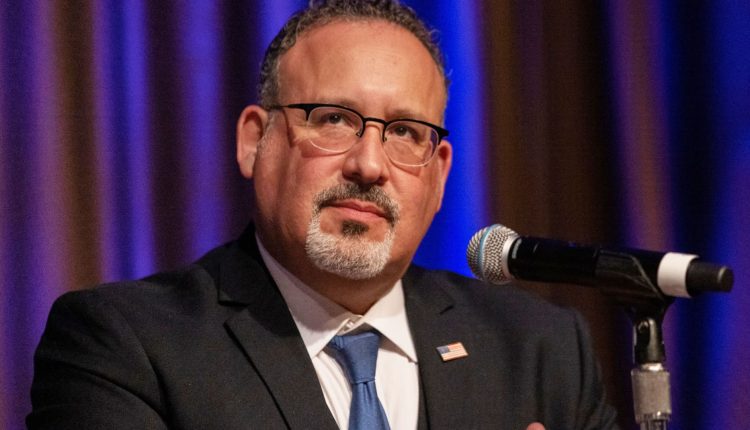 U.S. Secretary of Education Miguel Cardona speaks during the National Action Network’s National Convention in New York on April 12, 2023.