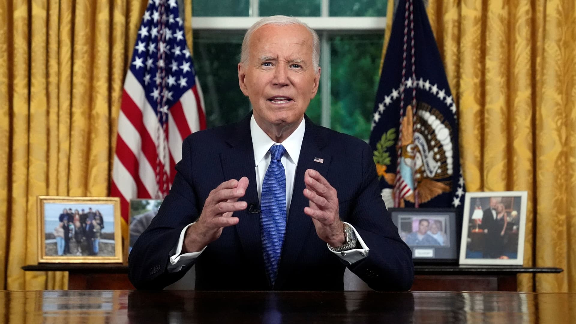 U.S. President Joe Biden addresses the nation from the Oval Office of the White House in Washington, Wednesday, July 24, 2024, about his decision to drop his Democratic presidential reelection bid.