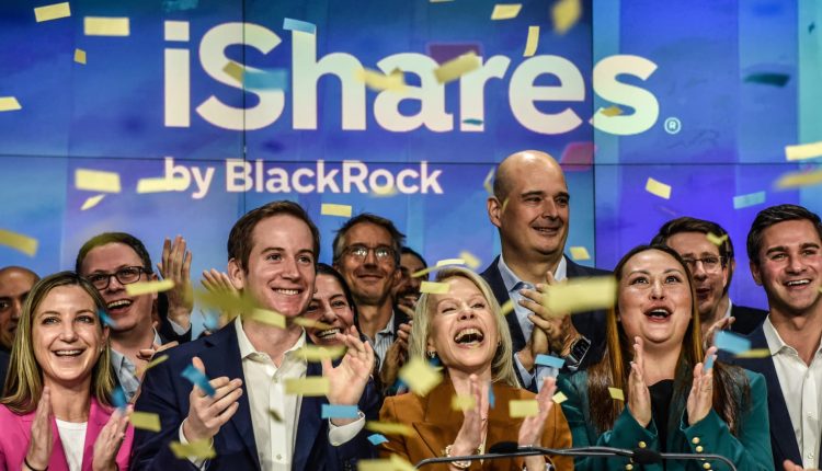 Samara Cohen, chief investment officer of ETF and index investments at Blackrock, center, rings the opening bell as bitcoin spot ETFs are launched on the Nasdaq Exchange in New York City on Jan. 11, 2024.