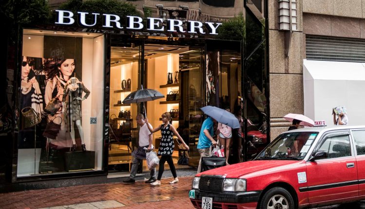Pedestrians walk past a Burberry Group Plc store, left, in the Causeway Bay shopping district of Hong Kong, China.