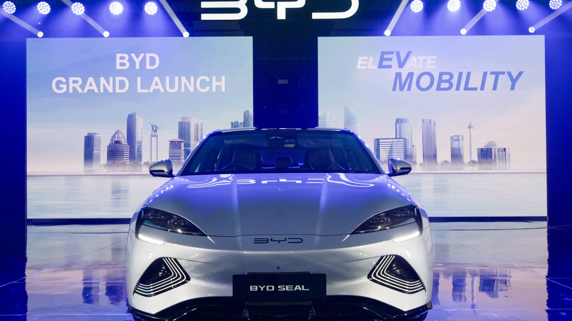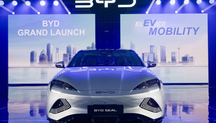 Newly launched BYD Seal is displayed during the launch of the Chinese-made BYD brand in Jakarta, on January 18, 2024, and at the same time introduced 2 other types of battery-powered vehicles (EV, electric vehicle) that will be sold in Indonesia, with an investment of 1.3 billion US dollars. (Photo by BAY ISMOYO / AFP) (Photo by BAY ISMOYO/AFP via Getty Images)