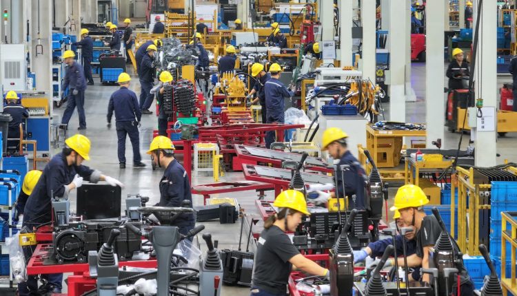 Workers assemble mini excavators in a factory of heavy machinery in Suzhou in east China’s Jiangsu province on Oct. 23, 2023.