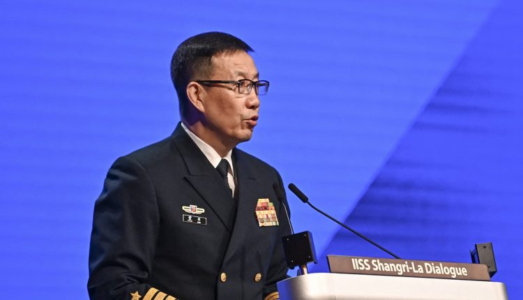 China’s Defense Minister Dong Jun speaks during the 21st Shangri-La Dialogue summit in Singapore on June 2, 2024.