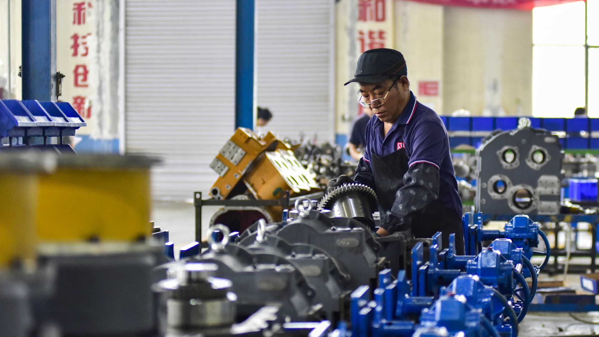 A worker assembling a loader transmission mechanism at a manufacturer in Qingzhou, China.