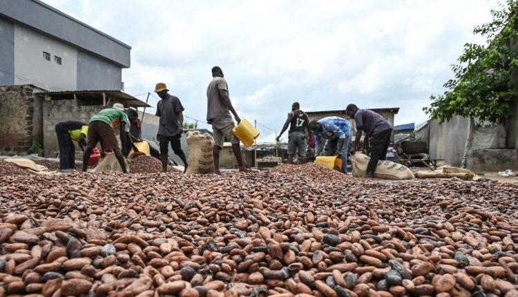 Workers collect dry cocoa beans in front of the store of a cocoa cooperative in the village of Hermankono on Nov. 14, 2023.