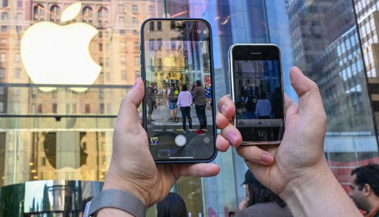 A person poses holding the original iPhone and the new iPhone 15 otuside the Fifth Avenue Apple Store ahead of the launch of Apple’s new iPhone 15 on September 22, 2022 in New York City.