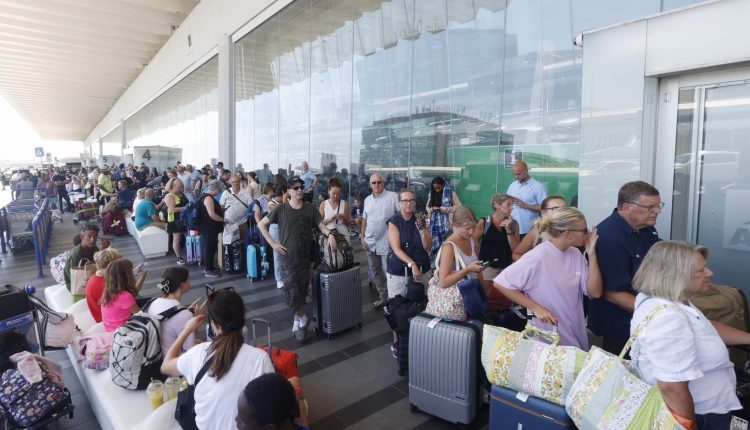 A general view from Rome Fiumicino International Airport as passengers gather and wait due to the global communications outage caused by CrowdStrike, which provides cyber security services to US technology company Microsoft, on July 19, 2024 in Rome, Italy.