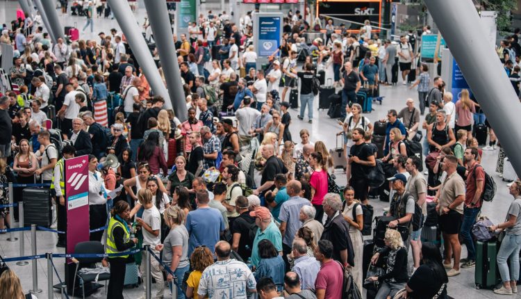 A general view from Dusseldorf Airport as passengers gather and wait due to the global communications outage caused by CrowdStrike, which provides cyber security services to US technology company Microsoft, on July 19, 2024 in Dusseldorf, Germany.