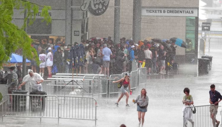 INDIANAPOLIS, IN – MAY 26: Spectators take shelter near Gasoline Alley during a rain delay before the start of the 108th running of the Indianapolis 500 on May 26, 2024, at the Indianapolis Motor Speedway in Indianapolis, Indiana. (Photo by Brian Spurlock/Icon Sportswire via Getty Images)