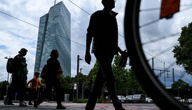 People cross a street in front the headquarters building of the European Central Bank (ECB) in Frankfurt am Main, western Germany, on June 5, 2024.