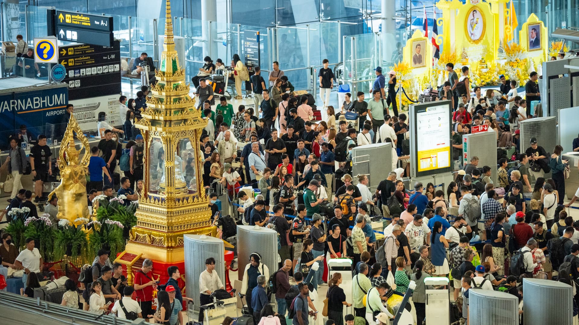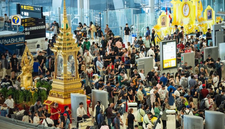 Crowds are seen building up at Suvarnabhumi Airport as a global IT disruption caused by a Microsoft outage and a Crowdstrike IT problem combine to affect users on July 19, 2024 in Bangkok, Thailand.