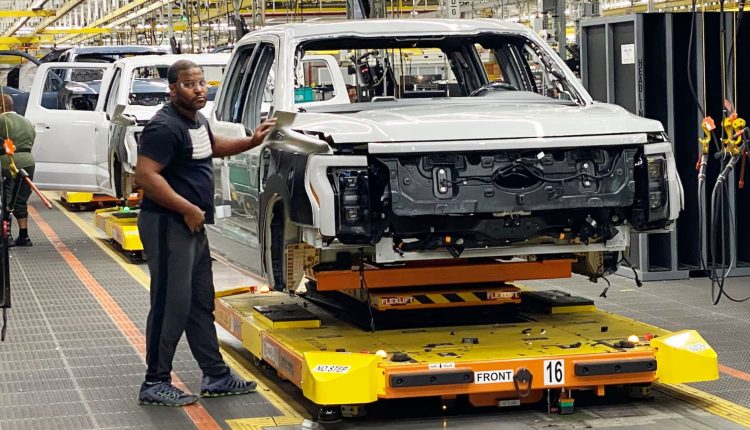 Ford workers produce the electric F-150 Lightning pickup on Dec. 13, 2022 at the automaker’s Ford Rouge Electric Vehicle Center (REVC).