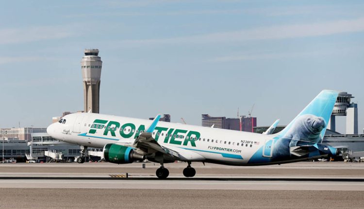 A Frontier Airlines plane lands at the McCarran International Airport in Las Vegas on Feb. 27, 2020.