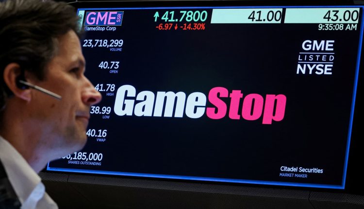 A trader works as a screen displays the trading information for GameStop on the floor at the New York Stock Exchange on May 15, 2024.