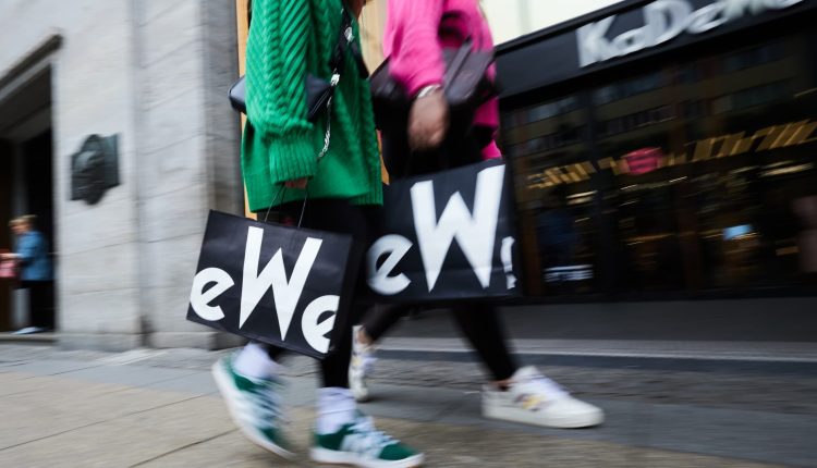 Women with KaDeWe carrier bags walk past the entrance to the Kaufhaus des Westens department store.