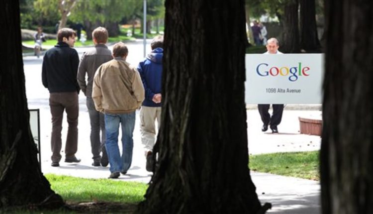Google workers walk outside of Google headquarters in Mountain View, Calif., Thursday, April 12, 2012. Google Inc. said Thursday that it earned $2.89 billion, or $8.75 per share, in the first quarter. That’s up from $1.8 billion, or $5.51 per share, a year earlier. (AP Photo/Paul Sakuma)