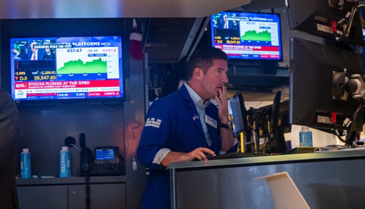 Traders work on the floor of the New York Stock Exchange (NYSE) on August 05, 2024, in New York City.