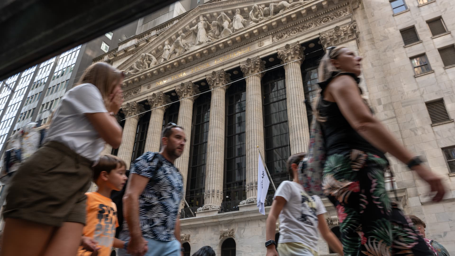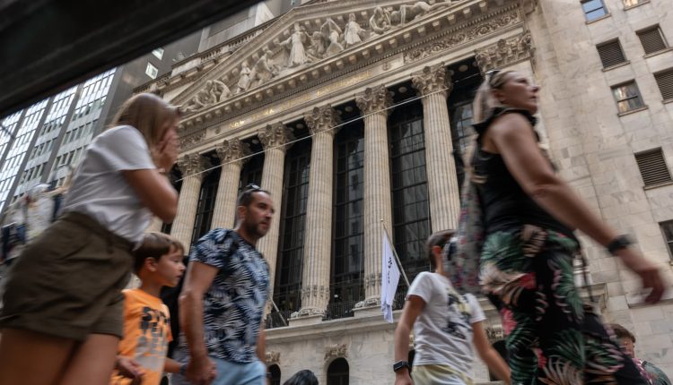 People walk through the financial district near the New York Stock Exchange (NYSE) on September 19, 2024, in New York City.