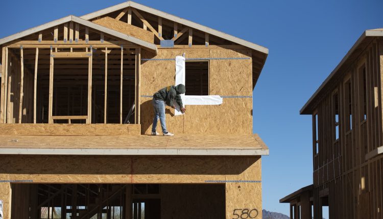 A contractor works on a new home under construction in Tucson, Arizona, on Tuesday, Feb. 22, 2022.