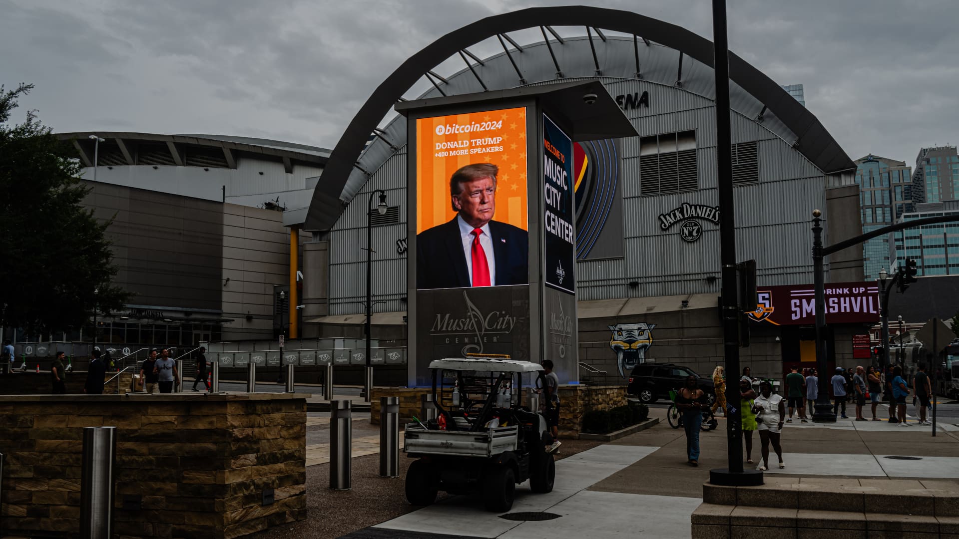 Former President Donald Trump’s photograph is seen on a digital display outside of the venue ahead of his afternoon keynote speech on the final day of the Bitcoin 2024 conference at Music City Center July 27, 2024 in Nashville, Tennessee.
