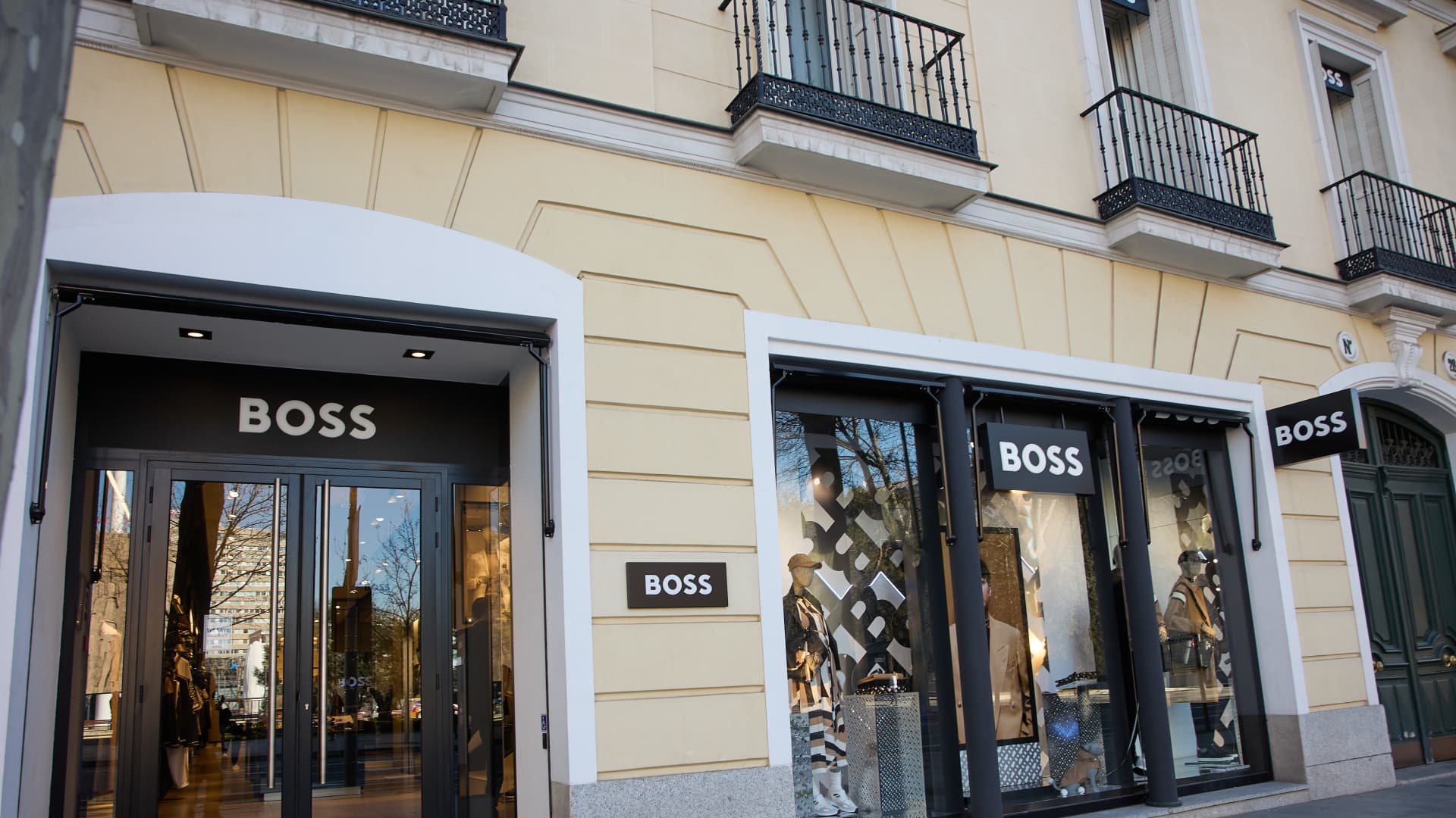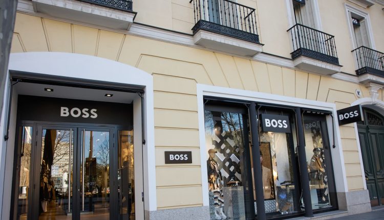 Façade and window displays of the Boss store by Hugo Boss, in the Salamanca district, on 25 February, 2023 in Madrid, Spain.